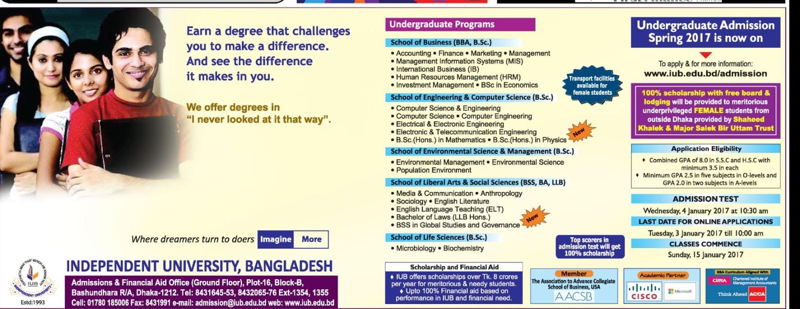Independent University Bangladesh Admission Spring 2017 WPAdmin 4th December 2016 Independent University Bangladesh Admission Spring 20172016-12-04T12:47:07+00:00 Private University Admission Last Updated on 4th December 2016 See also ULAB Admission Spring 2017 IUB