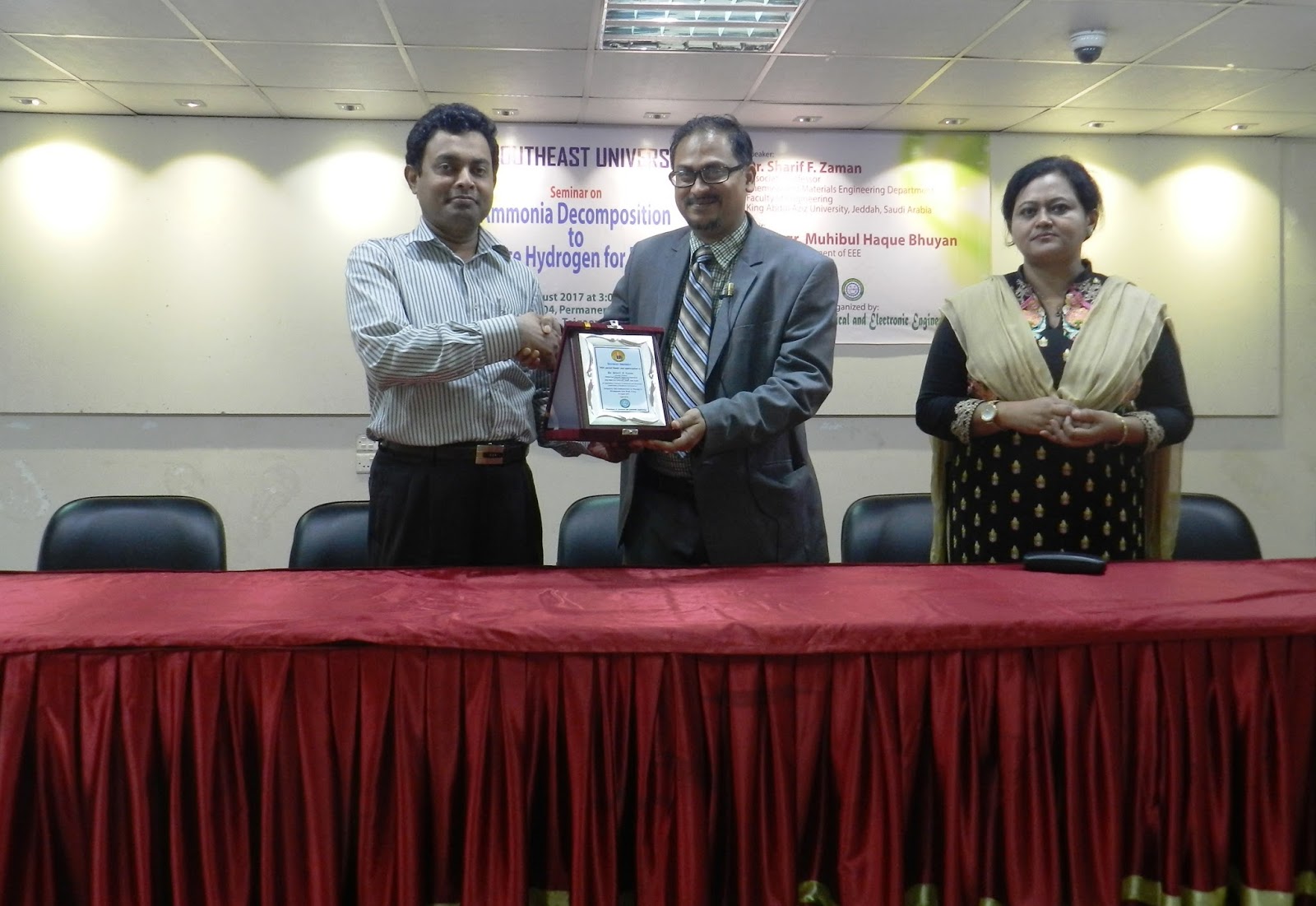 Dr. Sharif F. Zaman, Associate Professor, Chemical and Materials Engineering Department, Faculty of Engineering, King Abdul Aziz University, Jeddah, Saudi Arabia delivered a seminar titled“AMMONIA DECOMPOSITION TO PRODUCE HYDROGEN FOR FUEL CELL” on 2nd August 2017 at 03:00 pm in the Department of Electrical and Electronic Engineering of Southeast University, Tejgaon permanent campus.