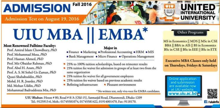 UIU MBA and EMBA Admission Fall 2016 WPAdmin 30th July 2016 UIU MBA and EMBA Admission Fall 20162016-07-30T09:55:18+01:00 Private University Admission Last Updated on 30th July 2016 United International University (UIU) invites applications from students for admission in MBA and EMBA on Fall 2016 semester. Details of the admission advertisement of UIU is given below See also State University of Bangladesh Admission Spring 2017 United International University (UIU)