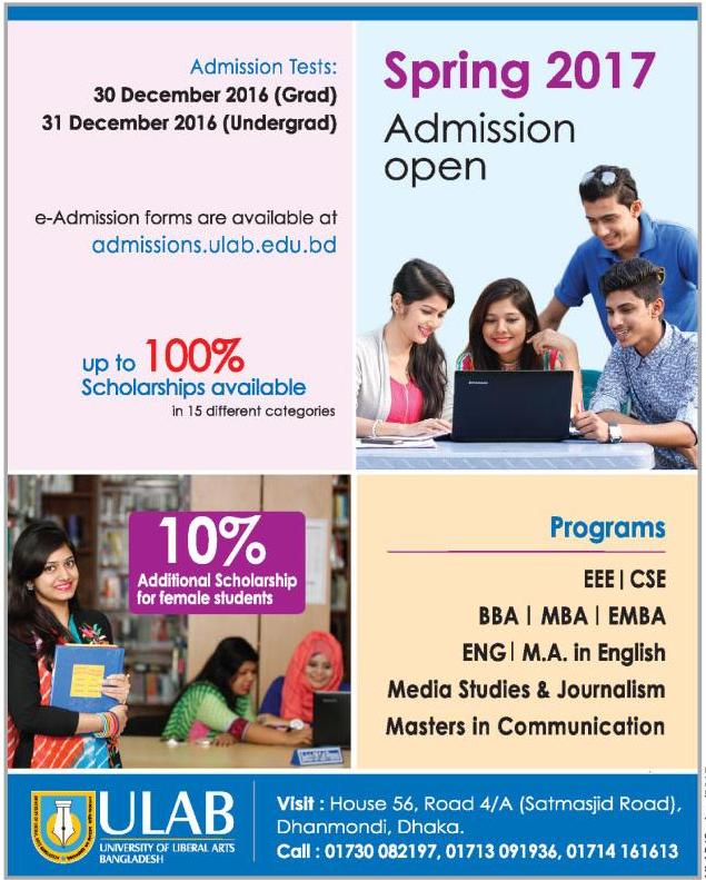 ULAB Admission Spring 2017 WPAdmin 4th December 2016 ULAB Admission Spring 20172016-12-04T12:34:39+00:00 Private University Admission Last Updated on 4th December 2016 See also Bangladesh University of Health Sciences-BUHS Admission and Rankings University of Liberal Arts Bangladesh (ULAB)