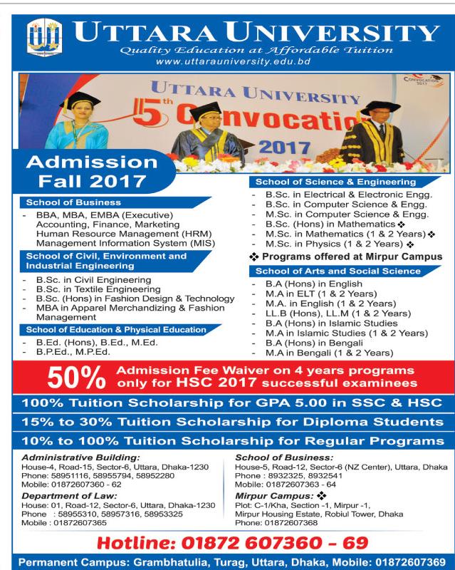 Uttara University Admission Circular Fall 2017 WPAdmin 28th July 2017 Uttara University Admission Circular Fall 20172017-07-28T18:35:44+01:00 Private University Admission Last Updated on 28th July 2017 See also Green University Admission Spring Semester 2017 Uttara University
